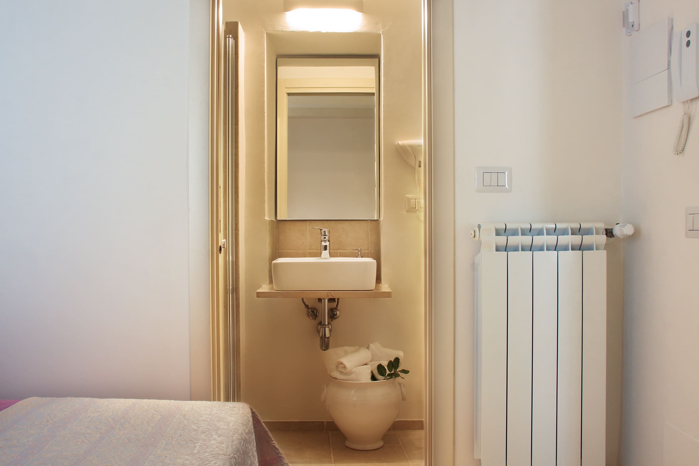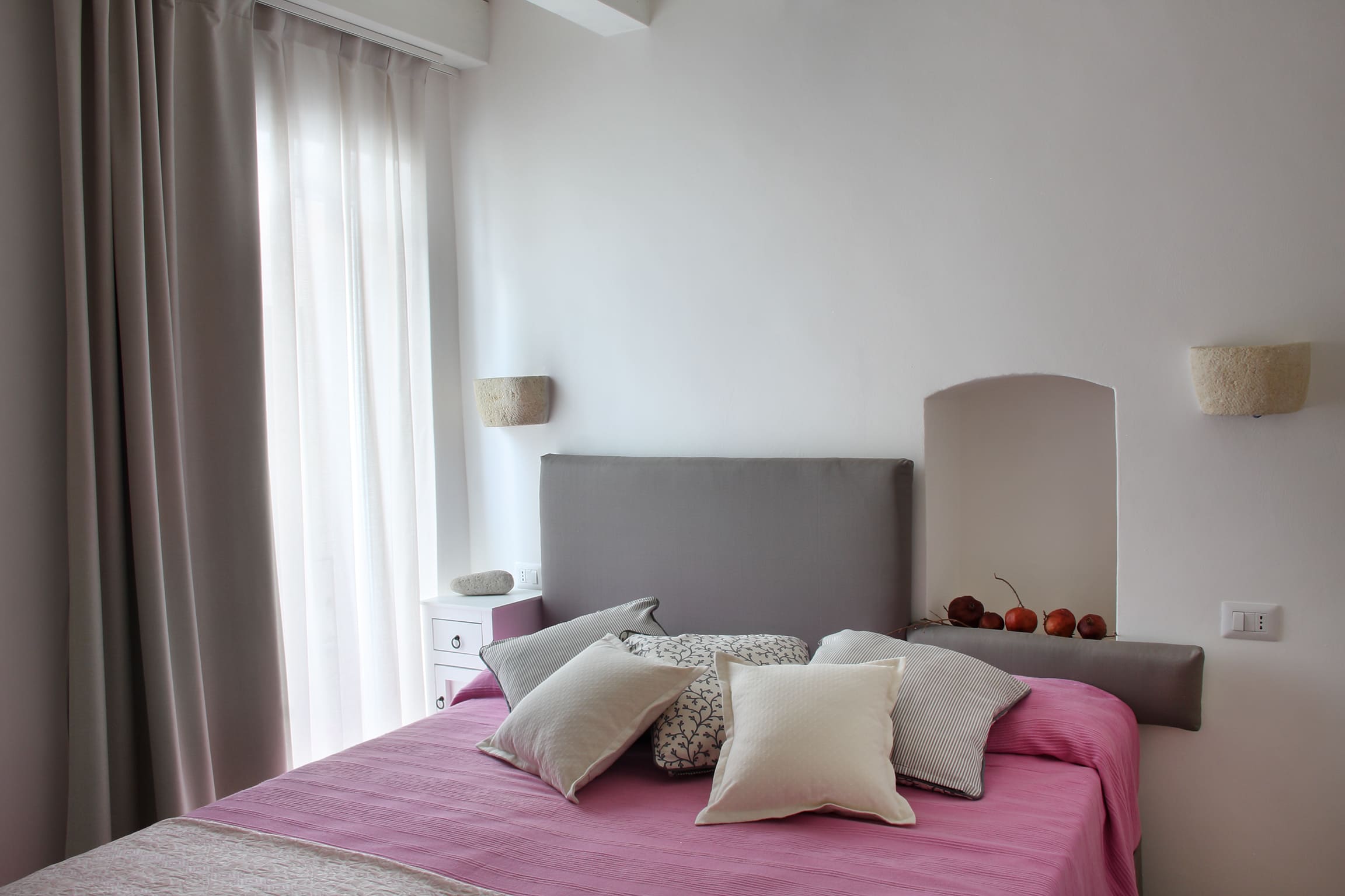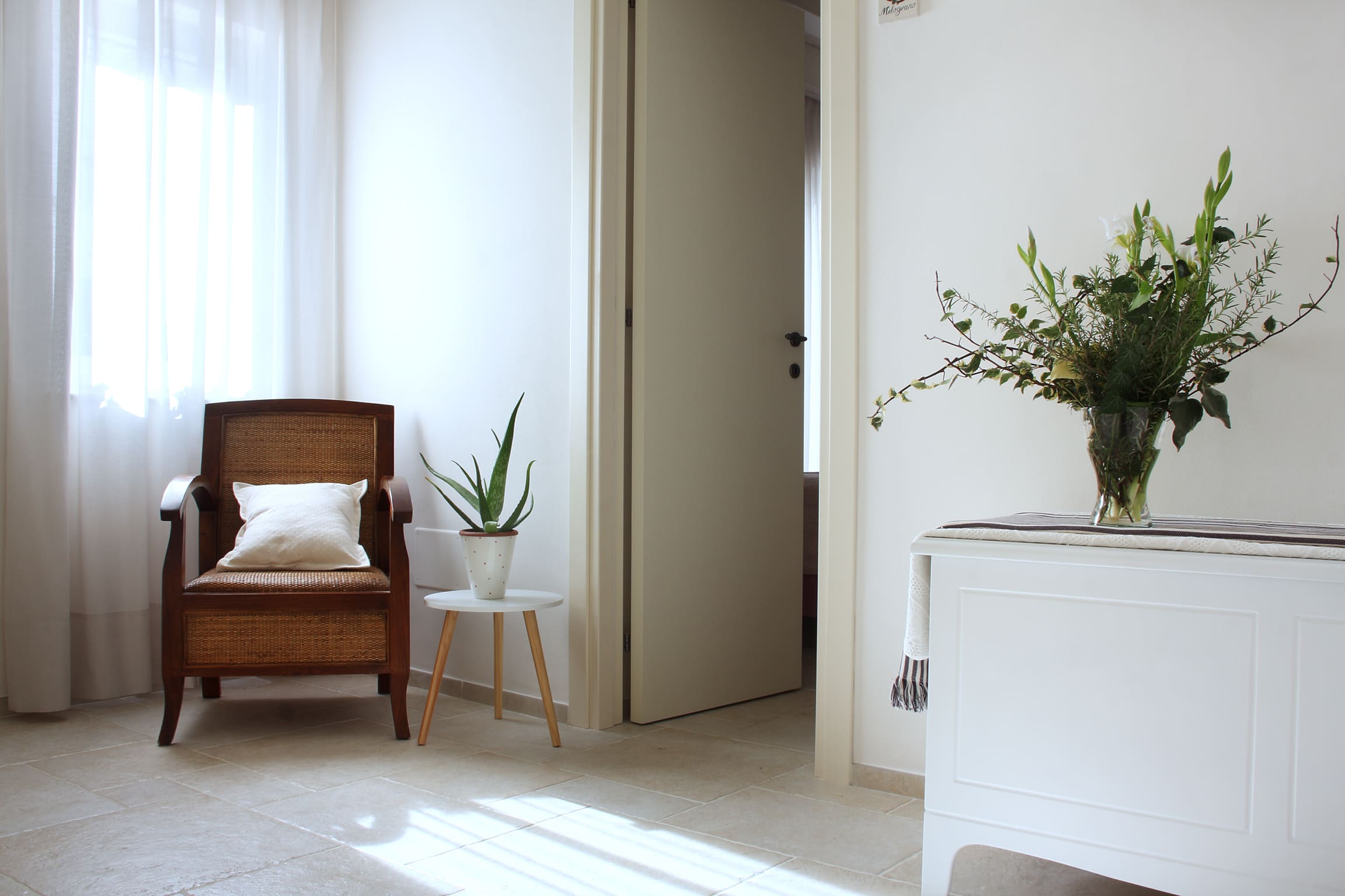 Stanza Il Melograno, la seconda camera matrimoniale del complesso Casa La Torre. Ubicata al primo piano di una palazzina storica, è composta da un letto matrimoniale e comodo bagno; è l’ideale per due ospiti che vogliono godere di comfort a pochissimi passi dal mare. Wi Fi gratuito in tutta la struttura. Ambienti climatizzati.